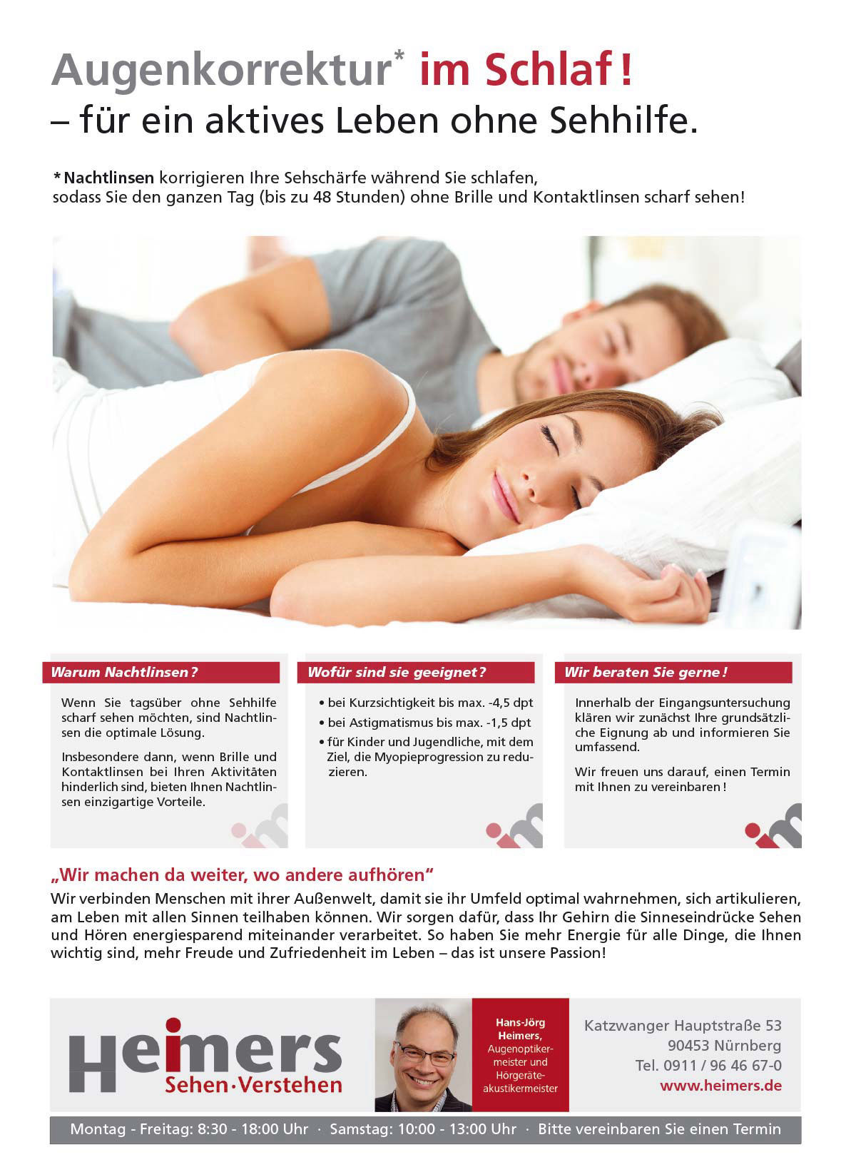 Ihr Augenoptiker und Hörgeräteakustiker Heimers in Nürnberg. Wir machen da weiter, wo andere längst aufhören und Sie werden erstaunt erkennen: Sehen ist nicht gleich Sehen und Hören ist nicht gleich Verstehen. Perfekt angepasste Brillen, Kontaktlinsen und Hörsysteme helfen dabei, die Leistungskraft Ihrer Sinne zu erhalten und sie gleichzeitig ohne Ermüdungserscheinungen zu fordern. Übrigens: Als von Zeiss zertifiziertes Relaxed Vision ® Center passen wir mithilfe neuester optometrischer Technologien die Brille individuell und optimal Ihren Augen an. Unsere Leistungen Fernbrille, Nahbrille, Gleitsichtbrille, Arbeitsplatzbrille, Raumbrille, Nachtbrille und DriveSafe-Gläser, Sonnenbrille, Gläser für die digitale Welt, ZEISS Brillengläser mit i.Scription® Technologie, Kontaktlinsen, Hörgerät, Hörsystem, Gehörschutz, Ohrhörer, PSA, In-Ear-Monitoring, Augenprüfung, Hörtraining, Höranalyse, Reparatur und Reinigung. Heimers, Ihr Augenoptiker und Hörgeräteakustiker, betreut Kunden aus Nürnberg, Katzwang, Reichelsdorf, Eibach und Schwabach.